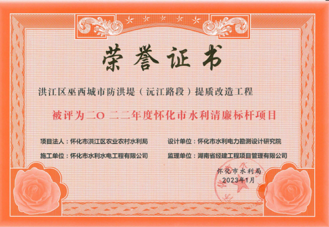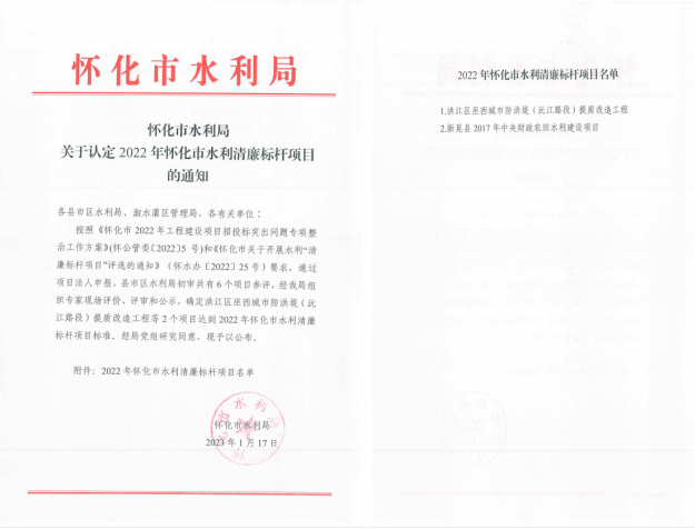 近日,从怀化市水利局传来消息,亚搏手机官方网站(洪江区巫西城市防洪堤沅江路段提质改造工程)喜获“2022年度怀化市水利清廉标杆项目”荣誉,清廉建设取得明显成效和充分认可。